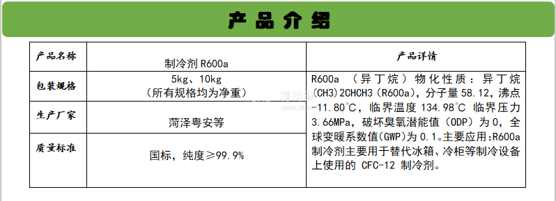 R600a (異丁烷)物化性質:異丁烷(CH3)2CHCH3(R600a),分子量58.12,沸點-11.80℃,臨界溫度134.98℃ 臨界壓力3.66MPa,破壞臭氧潛能值(ODP)為0,全球變暖系數值(GWP)為0.1。主要應用:R600a制冷劑主要用于替代冰箱、冷柜等制冷設備上使用的 CFC-12 制冷劑。