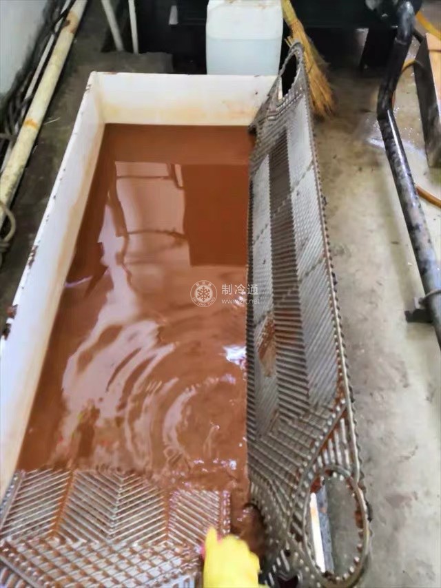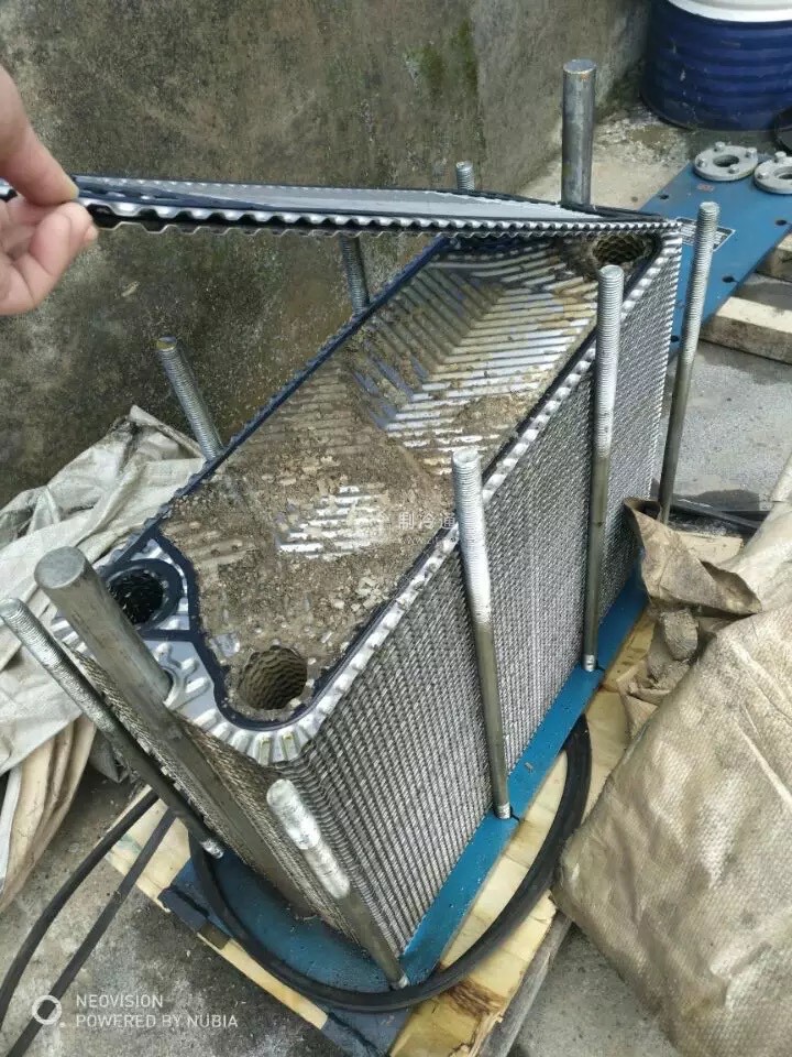 1.對板換進行反沖洗(關閉進出水閥門,斷開進水口,打開出水口閥門,沖洗3-5分鐘),以去除不牢固的銹垢、粘泥等;