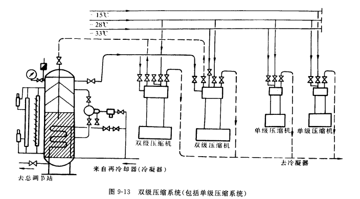 從圖9-13中不難看出,雙級(jí)壓縮系統(tǒng)的最大特點(diǎn)是具備中間冷卻器及必備的管道等,這是與單級(jí)壓縮系統(tǒng)最大的區(qū)別之一。中間冷卻器的作用一方面冷卻低壓級(jí)的過熱狀態(tài)的排氣,使高壓級(jí)壓縮后不致排氣濕度過高;另一方面中間冷卻器對(duì)到冷卻系統(tǒng)中去的液體制冷劑進(jìn)行第二次再冷卻,這種對(duì)到總調(diào)節(jié)站前的液體制冷劑進(jìn)行上次再冷卻的方法(再冷卻器和中間冷卻器的再冷卻),對(duì)系統(tǒng)的能量指標(biāo)是大大有利的。