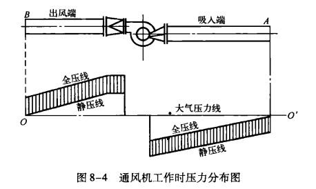如圖8-4所示,通風(fēng)機(jī)出口全壓值最大,而通風(fēng)機(jī)的總風(fēng)壓(總?cè)珘褐?/span>),則是通風(fēng)機(jī)進(jìn)出口全壓值絕對(duì)值之和。