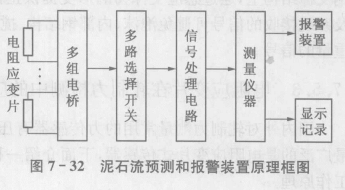 一旦泥石流發生,各鋼筋因泥石流沖壓而受到不同的力,應變片感受力后阻值變化,電橋有信號輸出,測量儀器有指示,報警裝置即可報警提示。其原理框圖如圖7-32所示。如需要遠距離自動報警,可加無線發送設施,將此信號發至觀測臺站。