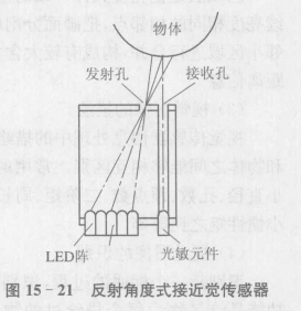 如圖15-21中所示的接近覺傳感器,將個發(fā)光元件沿橫向直線排列(線陣),并使之按一定順序發(fā)光,根據(jù)反射光量的變化及其時間,就可以求出發(fā)射角,從而確定被測物體的距離。