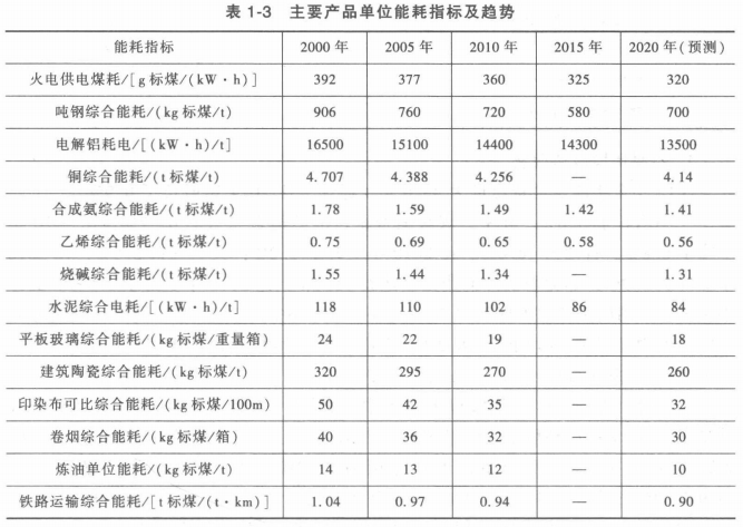 2.單位產(chǎn)品能耗2000年與2015年相比,我國火電供電煤耗由3929標(biāo)煤/(kW·h)下降到325g標(biāo)煤/(kW·h);煤油綜合加工能耗下降到63kg標(biāo)準(zhǔn)油//t;噸鋼綜合能耗由,)6kg標(biāo)煤/t下降到580kg標(biāo)煤/t;水泥綜合電耗由118 (kW " h)/t下降到86 (kW " h)/t;乙烯綜合能耗由0. 75t標(biāo)煤/t下降到0. 58t標(biāo)煤/t,詳見表1-3。