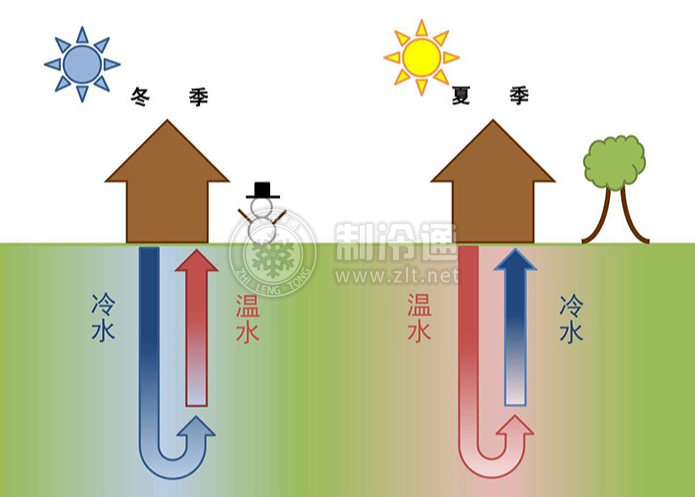 地熱制冷是用熱泵從淺層地能中以地熱蒸汽或地熱水為熱源,提供的熱能驅動吸收式制冷設備制冷的過程。吸收式制冷的工質是二元溶液,以溶液中沸點較低、受熱易揮發的組分為制冷劑,而沸點較高的組分為吸收劑。地熱蒸汽或地熱水在發生器內加熱一定濃度的溶液,使較低沸點的制冷劑蒸發為蒸氣。同時溶液濃度發生變化,進入冷凝器后,在冷凝器中被冷卻水冷凝為制冷劑液體,再經減壓閥減壓送到蒸發器,而后吸取冷媒的熱量而氣化達到制冷的目的。可以為用戶提供冬季供暖、夏季制冷空調、達到全年熱水供應或制冷空調的效果。