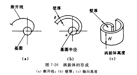 渦旋式壓縮機(jī)的工作時(shí)是由兩個(gè)渦旋體嚙合而成,渦旋體的型線(圖7-26)一般采用圓的漸開(kāi)線,其基圓半徑為α,利用漸開(kāi)線的不同起始角形成渦旋體的壁厚δ。當(dāng)軸向具有一定高度H時(shí)即形成渦旋體。