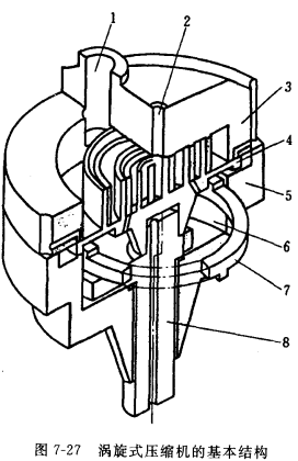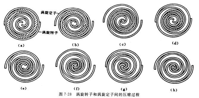 (圖7-28a~g,每圖相隔偏心軸 轉(zhuǎn) 角 120°)。壓縮過(guò)程一直持續(xù)到該兩小室的空間合并為一中心室和排氣口相通為止,然后開(kāi)始通過(guò)排氣口的向外排氣, 見(jiàn)圖7-28(h) ,并持續(xù)到小室的空間消失為止,此即排氣過(guò)程。在上述這些過(guò)程進(jìn)行的同時(shí),從圖7-29的(b)、(c)、(e)、(f)、(h)看到,外圈型面多次開(kāi)啟,把氣體不斷吸入到渦旋外圖小室,直到外圖端部閉合, 見(jiàn)圖7-28(d)、(g),多次完成其吸氣過(guò)程。由此可見(jiàn) ,在渦旋式壓縮機(jī)中,吸氣、壓縮、排氣等過(guò)程,是同時(shí)和相繼在不同渦旋小室中進(jìn)行的.據(jù)此,可以進(jìn)而理解到,渦旋式壓縮機(jī)中的壓縮過(guò)程是一具有一定的內(nèi)壓比,其中不需要設(shè)置吸氣閥和排氣閥,不存在余隙容積,工作中也就沒(méi)有膨脹過(guò)程。此外,由最外圈壓縮室的形成至最內(nèi)圈排氣結(jié)束,需經(jīng)我選轉(zhuǎn)子多次平移轉(zhuǎn)動(dòng)才能完成,從往復(fù)式、滾動(dòng)轉(zhuǎn)子式與渦旋式壓縮機(jī)的壓縮過(guò)程的比較得到,渦旋式壓縮機(jī)中氣體壓縮、排氣過(guò)程最為緩慢,流動(dòng)損失最小。