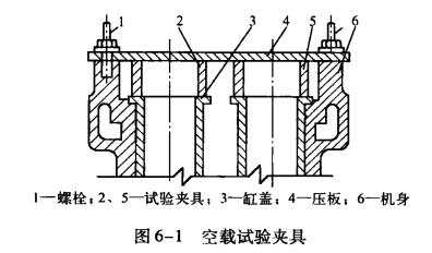 制冷壓縮機(jī)試運(yùn)行時(shí),不帶閥運(yùn)行稱空載試運(yùn)行。首先將壓縮機(jī)的汽缸蓋打開,取出安全壓板彈簧和排氣閥組,用專用試驗(yàn)夾具把汽缸套壓緊,以防止活塞上下運(yùn)動時(shí),把缸套打出汽缸之外。此專用試驗(yàn)夾具比較簡單,安裝時(shí)直接用汽缸蓋上的螺栓加固即可,如圖6-1所示。