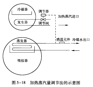 加熱蒸汽量調(diào)節(jié)法是以蒸發(fā)器冷媒水出口處的溫度為信號,通過調(diào)節(jié)加熱蒸汽量來改變制冷量的,如圖5-18所示。