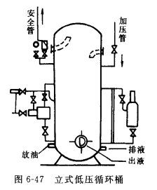 低壓循環(huán)桶的進(jìn)氣接頭直接與回氣總管相連 ,而出氣管與壓縮機(jī)吸氣管連結(jié),因此容器內(nèi)壓力與回氣壓力相同。使用氨泵時(shí),各蒸發(fā)溫度的系統(tǒng)應(yīng)設(shè)有單獨(dú)的低壓循環(huán)桶,并外包隔熱材料。