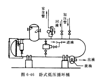低壓循環(huán)桶是裝置在氨泵制冷系統(tǒng)中的設(shè)備,它的功能是保證充分供應(yīng)氨泵的低壓氨液,同時(shí)也騎著液體分離器的作用。一般循環(huán)貯液桶分為立式和臥式兩種,見圖6-46與6-47。