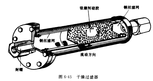 過濾器和干燥器安裝在冷凝器或貯液器的出液管上,如圖6-45所示。在熱力膨脹閥的進口處和壓縮機的吸氣口處有時也布置專用的過濾網。過濾器如被污物堵塞,則必須拆下濾網,用汽油清洗干凈后再裝上。干燥器中所用的干燥劑常用硅膠 ,有時也可用分子篩。這類干燥劑吸水能力很強,但隨著吸入水分的增加而 逐漸減弱,故必須定期將硅膠取出,并加熱烘干,去除水分后再裝入使用。