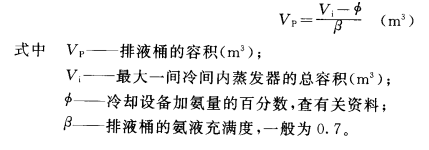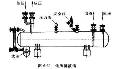 低壓排液桶如圖6-51所示。加壓閥接高壓排氣管,減壓閥接低壓吸氣管,回液管接冷庫沖霜回液管,出液管接至供液站。它的作用是在熱氨沖霜時,貯存由區發器或低壓循環桶過來的液體制冷劑,所以排液桶的容量應當能夠容納需要沖霜冷間中最大一間的氨液量。排液桶中存放的液體最高不得超過其容積的70%。