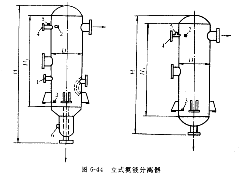 氣液分離器裝在氨制冷系統中稱氨液分離器。圖6-44是常用的立式氨液分離器,多用于壓力式或重力式供液系統。氨液分離器的功用是將蒸發器或冷卻排管內所蒸發的氣體在被吸入壓縮機之前將其中所含有的氨液分離出來,以保證壓縮機的干壓過程。另外,使節流后的氨液在經過氨液分離器后,將節流所產生的氣體分離出來,保證供給冷卻排管的是全部液體,以增加冷卻排管有效面積的吸熱作用。
