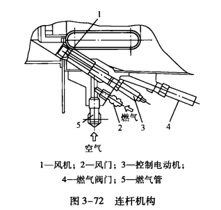 主燃燒器的空氣量和燃氣量調節機構是通過連桿機構相連的,如圖3-72所示。隨著負荷的變化,由控制電動機帶動連桿機構改變風門和燃氣閥門的開啟度。這樣,在高、中、低三種負荷下,可以保證有相應的過量空氣系數。在日常檢查時,應注意連桿機構接頭部位是否有松動的情況等。