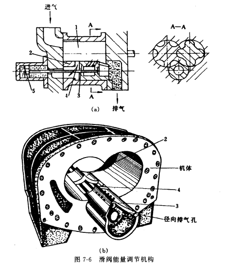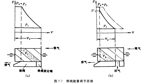 圖7-7為滑冰能量調節的原理圖。其中圖(a)為全負荷工作時的滑閥位置,此時滑閥尚未移動,工作容積中全部氣體被排出。圖(b)則為部分負荷時滑閥位置,滑閥向排氣端方向移動,旁通口開啟,壓縮過程中,工作容積內氣體在越過旁通口后才能進行壓縮過程,其余氣體未進行壓縮就通過旁通口回流詩吸氣腔。這樣,排氣量就減少,起到調節能量的作用。
