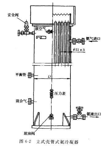 制冷劑蒸氣是從筒體的上部進(jìn)入冷卻水管間空中的(筒體內(nèi)) ,并在其中液化,冷凝液逐漸沉積于筒的底部。為了減少被分離的潤(rùn)滑油進(jìn)入蒸發(fā)器的可能性,氨液排出管的接頭距筒底應(yīng)有一定的距離。筒體內(nèi)氨液的液面可從裝在底部的玻璃指示器來(lái)觀測(cè)。蓄積在底部的潤(rùn)滑油可通過(guò)底部的放油效將油放出。此外,在冷凝器的主體上裝有進(jìn)氣、出液、放空氣、均壓及安全等管路接頭,并接通相應(yīng)的管路和設(shè)備。