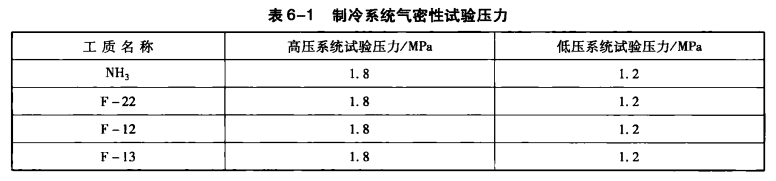 在利用壓縮空氣試壓時(shí),應(yīng)將壓縮機(jī)過(guò)濾器法蘭卸下,拿出過(guò)濾器經(jīng)清洗加上冷凍油后重新裝入吸氣腔內(nèi),打開(kāi)汽缸與曲軸箱的冷卻水閥,用手動(dòng)盤車,運(yùn)轉(zhuǎn)靈活后應(yīng)可以利用壓縮機(jī)加壓。首先打開(kāi)壓縮機(jī)的排氣閥,再關(guān)閉吸氣閥,先啟動(dòng)一下,若無(wú)其他不正常現(xiàn)象出現(xiàn)就可以繼續(xù)啟動(dòng)打氣,當(dāng)制冷系統(tǒng)內(nèi)壓力達(dá)到試驗(yàn)壓力時(shí),即可停止壓縮機(jī),關(guān)閉高、低壓交界處的閥門,穩(wěn)壓24h。制冷系統(tǒng)氣密性試驗(yàn)壓力參見(jiàn)表6-1。