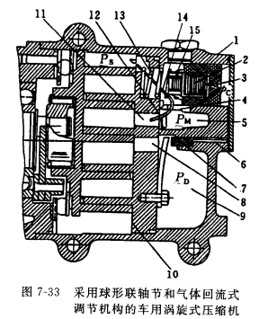 變頻輸氣量調節是渦旋式壓縮機很合適的輸氣量調節方法,除外,也有采用旁通回流式調節機構,它是在渦旋定子的背側端面上,在某一中間壓縮室處,開設一對回流孔11(圖7-33)。在要求調節時,使氣體只經微小壓縮而回流至吸氣側,從而實現其能 量調節。氣體的回流由活塞式控制閥 1來控制。當渦旋壓縮機停機時,活塞式控制漿由彈簧13 項開,使回流孔全開, 這樣在起動時可保證渦旋式壓縮機處于卸載狀態。