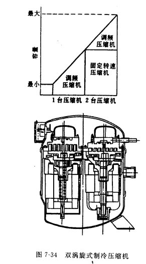 在這方面 ,值得一提的是日本東芝公司所開發的雙渦旋式壓縮機。雙渦旋式壓縮機是將兩個渴旋式壓縮機封裝在同一個機這中,其中一個為常規的固定轉速的渦旋式壓縮機。另一個為可以進行調頻無級調速的渦旋式壓縮機(圖7-34)。此機是根據大樓超級多聯空調機的需要而研制的。這是因為多聯機具有很長的管道 ,壓頭要求高 ,系統分支多。這就需要大大增大制冷劑和潤滑油量 ,將兩個濁旋式壓縮機并置在同一機殼中,則在機殼中所允許貯存的制冷劑和潤滑油量可以增大以保證壓縮機運行的更大可靠性,此機的特點有:功率范圍為0.75~7. 5kW,可實現無級調節 ( 見圖7-34上圖); 部分負荷效率下降少;用于熱泵中在低環境溫度下的供熱量下降少。