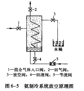 (1)如圖6-5所示,首先開啟入口閥,讓冷凝器不凝氣體與氨的混合物進入空氣分離器,空氣分離器處于待工作狀態,不進氣時再關閉入口閥。