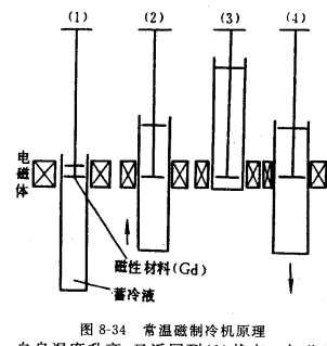 20世紀80年代,曾用金屬釓作為磁性材料,在常溫19℃下制冷,獲得了-30℃的低溫。圖8-34為常溫磁制冷機原理。把包置于水和酒精混合成的著冷液頂部 [圖中(1)],此時使電磁鐵通電,磁性體增磁至最強而向蓄冷液放熱,磁性體和萃冷液均升溫;在磁極化強度不變的情況下,使磁性體不動,而蓄冷簡慢慢上升,此時它們的溫度將逐漸下降 [圖中(2)];提升蓄冷筒, 讓磁性體處于筒底部 [圖中(3)],此時去磁使磁極化強度由最強降至零 ,磁性體從蓄冷液吸熱,磁性體和蓄冷液都降低溫度,達到制冷目的;在磁極化強度維持零的條件下,把蓄冷液筒慢慢下降 ,[圖中(4)],磁性體不斷從董冷液中吸熱,自身溫度升高,又返回到(1)狀態,如此反復,構成磁制冷循環。這種磁制冷的管件,首先是性能穩定的磁介質,其次是蓄冷材料及蓄冷方式。