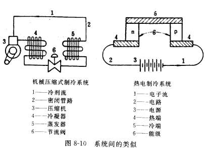 機械壓縮式制冷與熱電制冷系統(tǒng)間存在著一些類似的地方,各對應(yīng)部位見圖8-10。