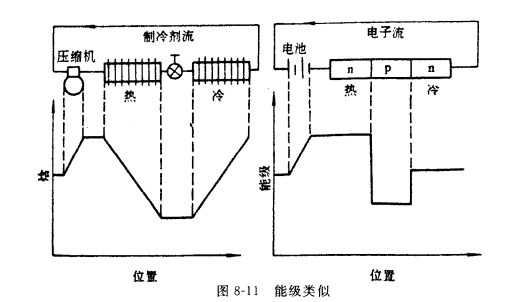 每個系統(tǒng)中,最重要的是熱邊和冷邊內(nèi)能改變的方法。對于蒸氣壓縮循環(huán), 節(jié)流閥是使能量變化的設(shè)備。當(dāng)制冷劑離開冷凝器時,它是處在高壓和中等溫度下的飽和液體,當(dāng)制冷劑通過節(jié)流閥時,它絕熱等焓膨脹。因此,制冷劑是作為低壓、低溫、低質(zhì)量的蒸氣而離開節(jié)流閥 ,而且處于最低的能級狀態(tài)。這使制冷劑在碌發(fā)過程中能吸收大量的熱。沒有節(jié)流風(fēng),壓力就不變,制冷劑的始就不變,也就不會出現(xiàn)“抽熱”。在熱電制冷系統(tǒng)中的類似部分是p型和n型半導(dǎo)體材料中電子能量的差,假若整個系統(tǒng)電子能級相同,也就不會出現(xiàn)“抽熱”。兩種系統(tǒng)的能級圖示于圖8-11。