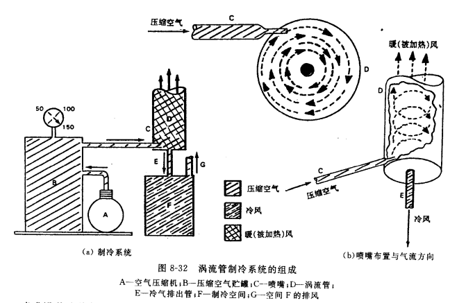 8-32畫(huà)出渦流管制冷的系統(tǒng)和工作過(guò)程,其系統(tǒng)由空氣壓縮機(jī)A、壓縮空氣貯罐B、噴嘴 C渦流管D和被冷空間 F組成。在D、C、E處有三個(gè)開(kāi)口。如前所述 , 一個(gè)是進(jìn)口,另外兩個(gè)為出口。進(jìn)口C是與空氣源B相連的噴嘴,噴嘴以一定的角度將室氣射入渦流管中。由于噴嘴的設(shè)計(jì)以及氣流的高壓,空氣在大管中呈螺旋形迅速旋開(kāi),D和E兩個(gè)出口壓力都接近大氣壓。當(dāng)空氣流出E管時(shí),溫度會(huì)迅速降低,用此裝置可以獲得0℃以下的溫度。