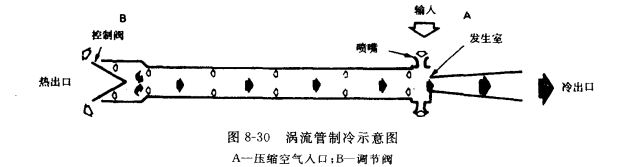 圖8-30是渦流管制冷的示意圖。高壓氣體從A端進人,流經許多小噴嘴時,原來的壓頭有所降低。氣體膨脹后,接近音速 ,如圖8-31所示。