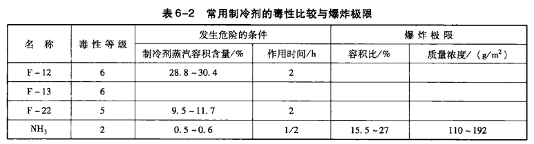 無論是氨或氟制冷裝置,其設(shè)備、管路、閥門、儀表等,都在一定的壓力下工作或靜置,特別是常用的制冷劑氨是有毒的,當(dāng)空氣中按體積計超過0.5%~0.6%時,人就會中毒。在這種濃度下,人如果停留0. 5h,就可能發(fā)生危險。同時氨與空氣混合,含量達到15.5%~27%(體積計)時,遇火會發(fā)生爆炸。而氟制冷劑遇火時,又會分解出有毒氣體(光氣)。因此,在各種制冷裝置中,均設(shè)有安全防護裝置。在空調(diào)用制冷裝置中,常用制冷劑的毒性比較與爆炸極限參見表6-2。