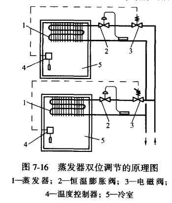 對于一個壓縮機對應一個蒸發器的小型制冷裝置,如房間空調器、冰箱、冷藏柜等,雙位控制可用溫度控制器直接控制壓縮機或同時控制蒸發器與壓縮機的停開來實現調節。