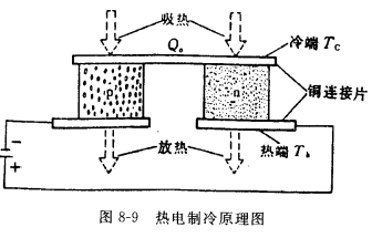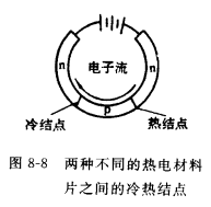 如圖8-9把一只p型半導體元件和一只半導體元件聯(lián)結成熱電偶,接上直流電源后,在接頭處就會產(chǎn)生溫差和熱量的轉移。在上面的一個接頭處,電流方向是mp,溫度下降并且吸熱,這就是冷端。而在下面的一個接頭處,電流方向是p→n,溫度上升并且放熱,因此是熱端。