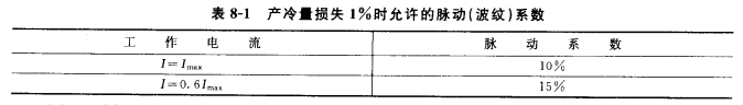熱電制冷裝置使用直流電工作,對于工作電壓的脈動范圍有一定的要求。如果人允許的產冷量損失為1%左右, 那末電壓的脈動(波紋)系數(交流成分有效值與直流成分的比值)不得超過表 8-1的值。