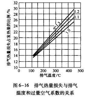 在直燃型機組運行過程中,調(diào)節(jié)過量的空氣系數(shù)n,減小過剩的空氣量,可減小排氣的熱量損失,達到節(jié)能運行的目的。如圖6-16所示為排氣熱量損失與排氣溫度和過量空氣系數(shù)的關(guān)系曲線。