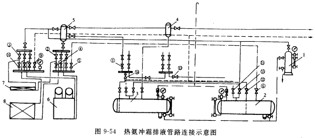 熱氨沖霜布置如圖9-54所示,熱氨從虛線(xiàn)進(jìn)入分調(diào)節(jié)站后進(jìn)入冷卻設(shè)備,液化后經(jīng)分調(diào)節(jié)站的點(diǎn)劃線(xiàn)回到排液,再加壓、放油、排液后,把系統(tǒng)(如熱氨閥關(guān)閉,回液閥關(guān)閉,分調(diào)節(jié)站恢復(fù)工作狀態(tài))復(fù)原。