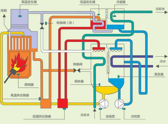運行過程中,若冷凝器或高壓發生器壓力過高(高壓發生器和低壓發生器出口處濃溶液溫度過高時征兆之一),也可分別對冷凝器或高壓發生器抽氣。但一般情況下,關閉冷凝器和高壓發生器的抽氣閥,由吸收器抽氣。蒸發器抽氣閥門是在采暖運轉時進行抽氣使用,制冷運轉時通常為關閉狀態。