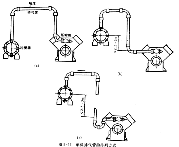 5)為防止壓縮機停車后,排氣管內(nèi)的潤滑油及制冷劑氣體凝結(jié)成液體返回壓縮機而 造成起動時出現(xiàn)液擊事故,則要求氟系統(tǒng)的排氣管向油分離器(或冷凝器)有1%~2%6的坡度,見圖9-67(a)。