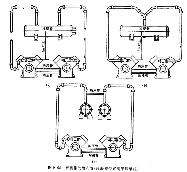 7)兩臺壓縮機合用一個冷凝器,而冷凝器位置又高于壓縮機時,排氣管可按圖9-68(a)、(b)所示布置。對兩臺壓縮機分別用兩臺冷凝器,而其管道又要相互連接的時候,可按圖9-68(c)方式布置。