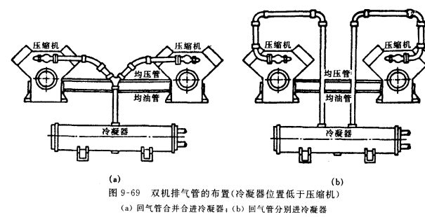 當(dāng)冷凝器位置低于壓縮機時,可按圖9-69布置排氣管道。裝均油管的目的是使兩臺壓縮機的油面在同一水平面上,均壓管是使兩臺壓縮機的曲軸箱具有相同的壓力。