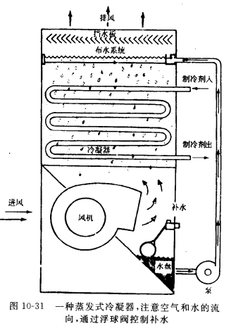 蒸發式冷凝器系統將制冷劑送到類似冷卻塔的冷凝器。在這個系統中,正如“蒸發式"所暗示的,水被噴射或滴流在冷凝器上,這樣就使之冷卻。水循環僅僅在冷凝器箱體內, 見圖10-31。
