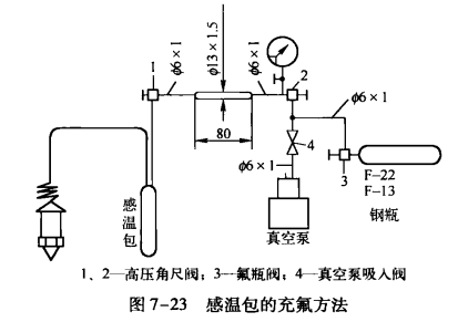 如圖7-23所示為感溫包的充氟方法,在閥1和閥2之間,用兩根?6mm x 1 mm短管與?13mm x 1. 5mm紫銅管連接。將充注的感溫包及毛細管做1.0MPa氮氣壓力試驗和沉水檢查。如果不漏,卸壓后按圖7-23連接。在管路中安裝-0.1~+ 1. 6MPa的壓力表一塊,兩個閥門均為1/4英寸直角高壓閥。并將氟瓶升高,以便充注F-22能順利流入?13mmx1.5mm的紫銅管中。