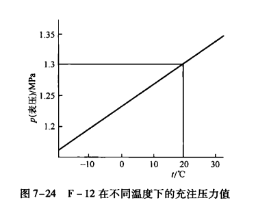 如圖7-23所示,首先按充注F-22的方法接管、抽真空。不過感溫包試驗壓力應提高到1. 5MPa左右,然后將感溫包放在環(huán)境溫度中約2h,開啟閥2,關閉閥1,緩慢開啟閥3,當壓力表上升到一定壓力(此壓力根據(jù)環(huán)境溫度決定),立即關閉閥3, F-12在不同溫度下的充注壓力值如圖7-24所示,最后按充注F-22的方法,將F-12充入感溫包中,然后夾扁F-12感溫包充注毛細管,并焊牢。這時充注F-12的質(zhì)量約為8 -9g。