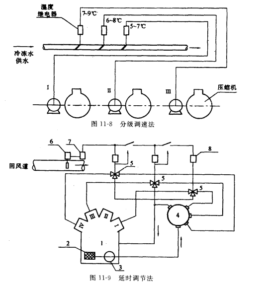 ①分級調節法。分級調節法就是將被控參數(冷凍水出口溫度,制冷壓縮機的吸氣壓力等),分為若干級,每級裝一個溫度繼電器或壓力繼電器整定各自不同的給定值,以便控制各臺壓縮機或各個氣缸的啟停。圖11-8為三臺同型號的制冷壓縮機,負責供應5~9℃的冷凍水,采用分級調節 ,在冷凍水總出水管上裝三個幅差為2℃的溫度繼電器,其整定值分別調至 5℃、6℃和7℃ ,這樣,當冷凍水溫達到5℃時,三臺制冷壓縮機全部停止運行 ,當冷凍水溫達到9℃時,三臺制冷壓縮機全部投入工作。