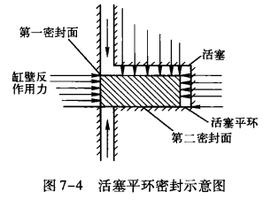 活塞環開口在自由狀態時,其直徑大于汽缸的直徑,由于活塞環本身彈力的作用,裝入汽缸后,對汽缸壁產生一個壓力,汽缸壁反過來給一個反作用力,從而形成第一道密封面,如圖7-4所示。另一方面活塞向上運動時,由于蒸汽壓力和慣性力的作用,把活塞環推向一邊,使端面造成密封,也就是第二密封面。又由于氣環開口關系,為確保密封,一個活塞上往往安裝兩只以上活塞平環,把制冷劑蒸汽泄漏降低到最低限度。