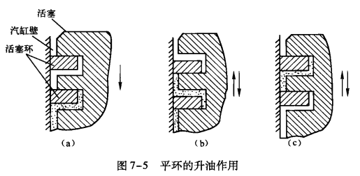 油為什么會沿著活塞環上升呢?現在來分析一下它的運動過程,如圖7-5所示。當活塞在汽缸內作往復運動時,平環(氣環)在環槽里,由于受到缸內制冷劑蒸汽的壓力,本身質量的慣性力和汽缸壁摩擦力的聯合作用,因此平環在環槽的邊間隙中上下跳動。當活塞向下時,平環跳至環槽的上端,平環從缸壁上刮下的油,被擠放到平環的邊間隙,和環槽深人空間,如圖7-5 (a)所示;當平環因壓力關系改變,而從上部跳到下部時,原環槽中的油立即被趕到上面空間,如圖7-5 (b)所示;活塞來回運動也會使平環不斷的上下跳動,逐步把油升高到活塞頂部,如圖7-5 (c)所示;然后與制冷劑蒸汽一道被排人氣腔。大量的油從汽缸頂部排入氣腔,對制冷系統中熱交換是不利的。這不僅增加了油的消耗,而且影響到制冷效果。為了克服這一弱點和危害,在活塞上增加了一根刮油環。刮油環和平環在結構上是有差異的。最簡單的油環,它的工作面有3/4的高度做成10°~15°的圓錐面,安裝斜度向上,圓柱面向下,這種油環常用在老系列產品制冷壓縮機中。