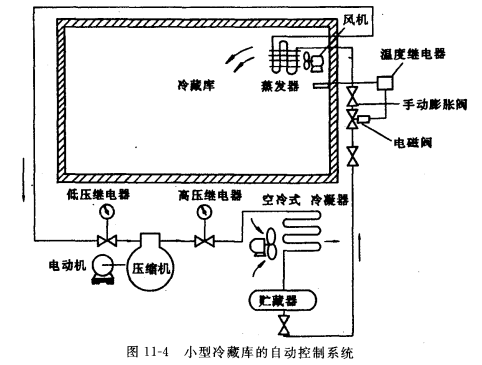 對冷藏庫的溫度進行控制,使庫濕低于規(guī)定溫度時,壓縮機停止運轉(zhuǎn);而當庫溫高于規(guī)定溫度時,壓縮機起動運轉(zhuǎn)(一般稱為雙位控制),這不僅節(jié)省了電力,而且還保證了冷藏貨物的質(zhì)量。但是,單純采用溫度繼電器控制壓縮機的開停是不行的。因為停機時,液體會繼續(xù)進入蒸發(fā)器,再起動時又很容易產(chǎn)生液擊及潮車運轉(zhuǎn)。為此,需要在膨脹閥的入口處加裝電磁閥,如圖11-4所示。溫度繼電器不直接控制壓縮機的開停,而是控制電磁閥的通斷。當冷藏庫溫下降時,溫度繼電器動作,使電磁閥關(guān)閉,停止供液,而蒸發(fā)器內(nèi)的制冷劑繼續(xù)蒸發(fā)并為壓縮機所吸入,并貯存于冷凝器或貯液器中。