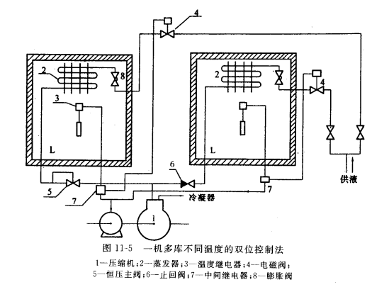 如圖11-5所示,當各冷藏庫工作溫度不同時,利用溫度繼電器,以控制制冷劑供液電磁閥的開與關,從而控制各蒸發器的供液量 ,保證每個控制對象的溫度維持在要求的溫度范圍內。當兩路供液管上的電磁閱均關閉時,還應通過中間繼電器或壓縮機吸氣管路上的低壓繼電器,使壓縮機停止運行。