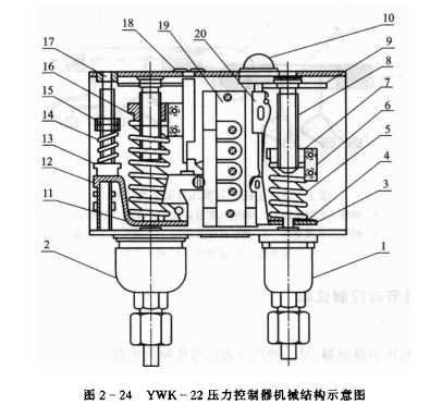 YWK-22型壓力控制器。YWK-22型壓力控制器是將高壓過高保護(hù)和低壓過低保護(hù)兩部分合并裝在一個(gè)殼體內(nèi),適用于制冷壓縮機(jī)的排氣壓力過高和吸氣壓力過低保護(hù),也稱為高低壓控制器,其結(jié)構(gòu)示意圖如圖2-24所示。