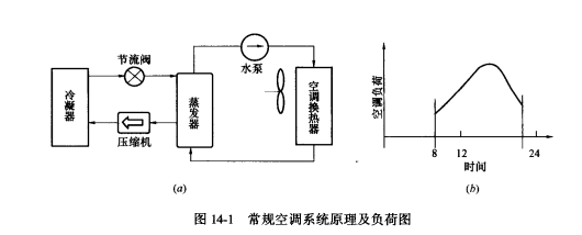 圖14-1(a)是常規(guī)空調(diào)系統(tǒng)原理圖;14-1(b)是空調(diào)負(fù)荷圖。