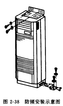 圖2-38為細長條型的室內機組采用防傾措施的示意圖,由于機組的厚度僅有40cm,故置于地面上占地極小,但易于傾倒,為了防止前傾可用隨機所帶的一套附件(直角形鋼片夾具有螺釘)將其固定在墻壁上。一邊固定在室內機組頂部的平面上,一邊固定在墻壁上(直角折向墻壁)。可選擇在木龍骨或柱子上用螺釘緊固。由圖2-38可知,機組下部也有防傾倒的地板夾具,安裝時,可用自攻螺釘在機組左右兩側底部將其固定。